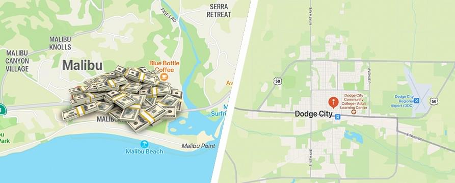 Here’s why… so if you think Malibu, CA vs. Dodge City, KS… the competition was fierce for primo zip codes, right?( by the way nothing against Kansas…).